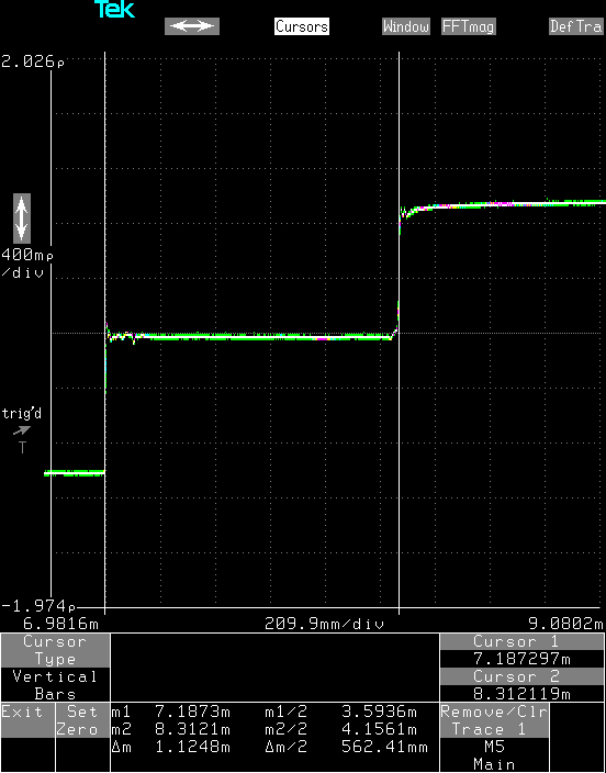 One of the more practical uses of TDR is to measure the distance to a short or open circuit on cables. If I attach a matched 50cm long coaxial cable to the connector on the scope, the pulse will travel to the end of the cable before being reflected back. The end of this cable was left open, so the same reflection as with the open port is seen, just delayed a lot.